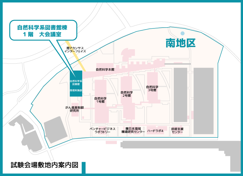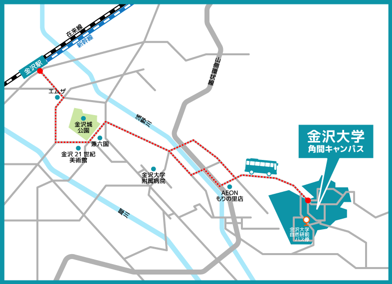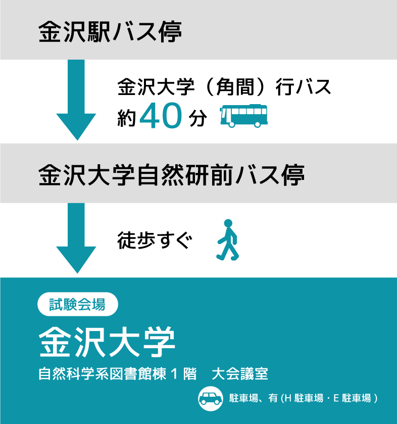 「金沢駅バス停」⇒金沢大学(角間)行バス(約40分)⇒「金沢大学自然研前」⇒徒歩(すぐ)⇒試験会場