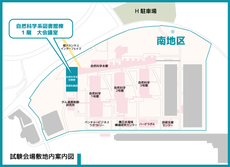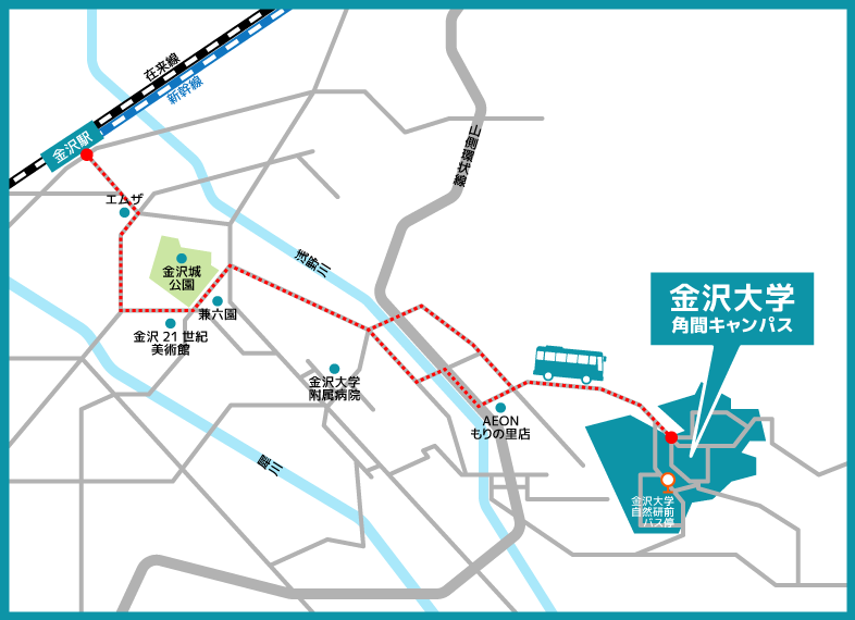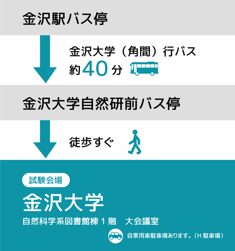 「金沢駅バス停」⇒金沢大学(角間)行バス(約40分)⇒「金沢大学自然研前」⇒徒歩(すぐ)⇒試験会場