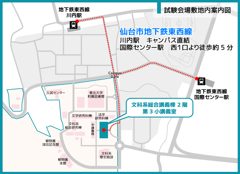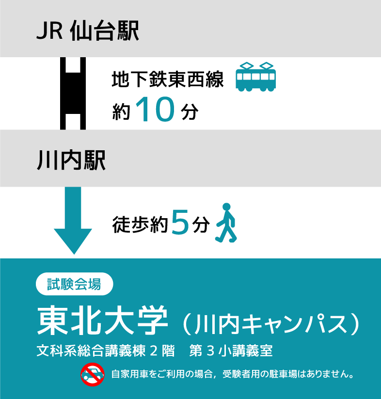 「仙台駅」⇒地下鉄東西線(約10分)⇒「川内駅」⇒徒歩(約5分)⇒試験会場