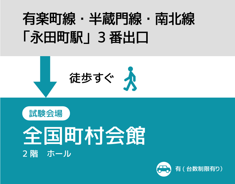 有楽町線・半蔵門線・南北線「永田町駅」3番出口⇒徒歩(すぐ)⇒試験会場