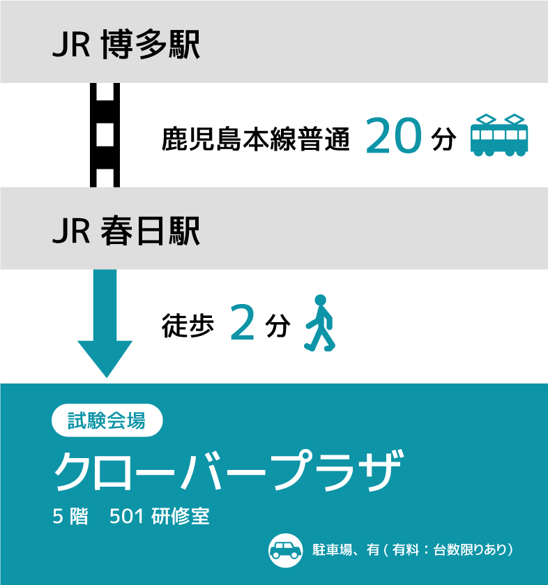 「JR博多駅」⇒鹿児島本線(約20分)⇒「JR春日駅」⇒徒歩(約2分)⇒試験会場